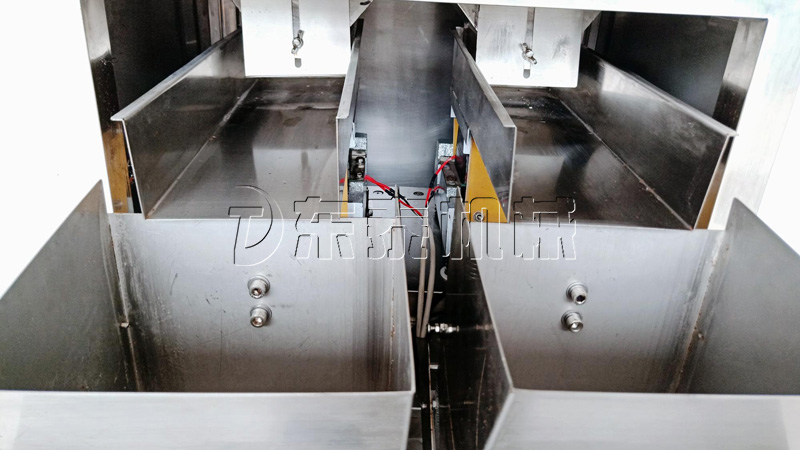 该机由机架、给料器、称料斗和电气箱四部分组成。开始工作时,将包装袋套夹在夹袋器上,拨一下夹袋运行开关,等待tx10毫秒后,三台给料器同时对称料斗快速喂料,喂料过程由控制仪表通过对传感器输出信号连续采样,并随时与大投值比较,当料重不小于大投值时,两台粗给料机自动停止,细给料机转为慢给料继续喂养,并与目标值比较,当料重接近目标比重时(称重值=目标值-落差值),停止喂料,延时dx10毫秒机器卸料。