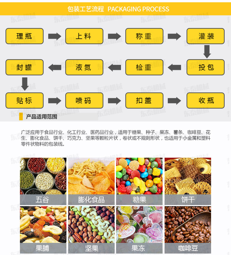 颗粒装瓶机 休闲食品颗粒瓶装(塑料瓶金属盖)称重包装机用于瓜子、花生、糖果、开心果、果仁、各类坚果、休闲食品、肉类等颗粒状、片状、条状及不规则形状物料的定量称重、分装、封口,适合各种圆形规格的易拉罐和异形罐,质量可靠,操作简便,是食品、制药、化工等行业必备的理想设备。