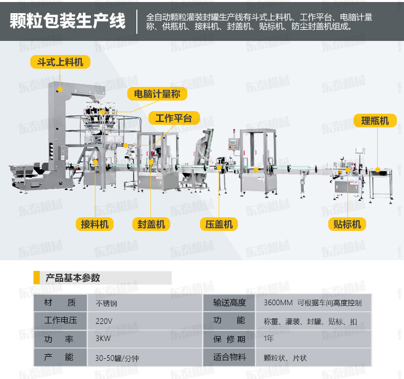 颗粒装瓶机 休闲食品颗粒瓶装(塑料瓶金属盖)称重包装机有Z型上料机、称架、10斗高精度组合秤、颗粒灌装机、封罐机、贴标机、压盖机组成,各个部分即各司其职又协同工作,非常稳定。外罩及主要零部件均采用304不锈钢,满足食品、药品卫生要求。