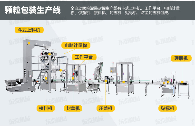 瓜子颗粒自动包装机有Z型上料机、称架、10斗高精度组合秤、颗粒灌装机、封罐机、贴标机、压盖机组成,各个部分即各司其职又协同工作,非常稳定。外罩及主要零部件均采用304不锈钢,满足食品、药品卫生要求。瓜子颗粒自动包装机可以根据产品特性和包装容器的要求,做灵活改动,比如十斗计量称可以更改成线性计量称,封罐机可以更改成旋盖机等。如有其它更多个性需要,可以联系我们的工程师协助设计。颗粒称重包装机用于瓜子、花生、糖果、开心果、果仁、各类坚果、休闲食品、肉类等颗粒状、片状、条状及不规则形状物料的定量称重、分装、封口,适合各种圆形规格的易拉罐和异形罐,质量可靠,操作简便,是食品、制药、化工等行业必备的理想设备。
