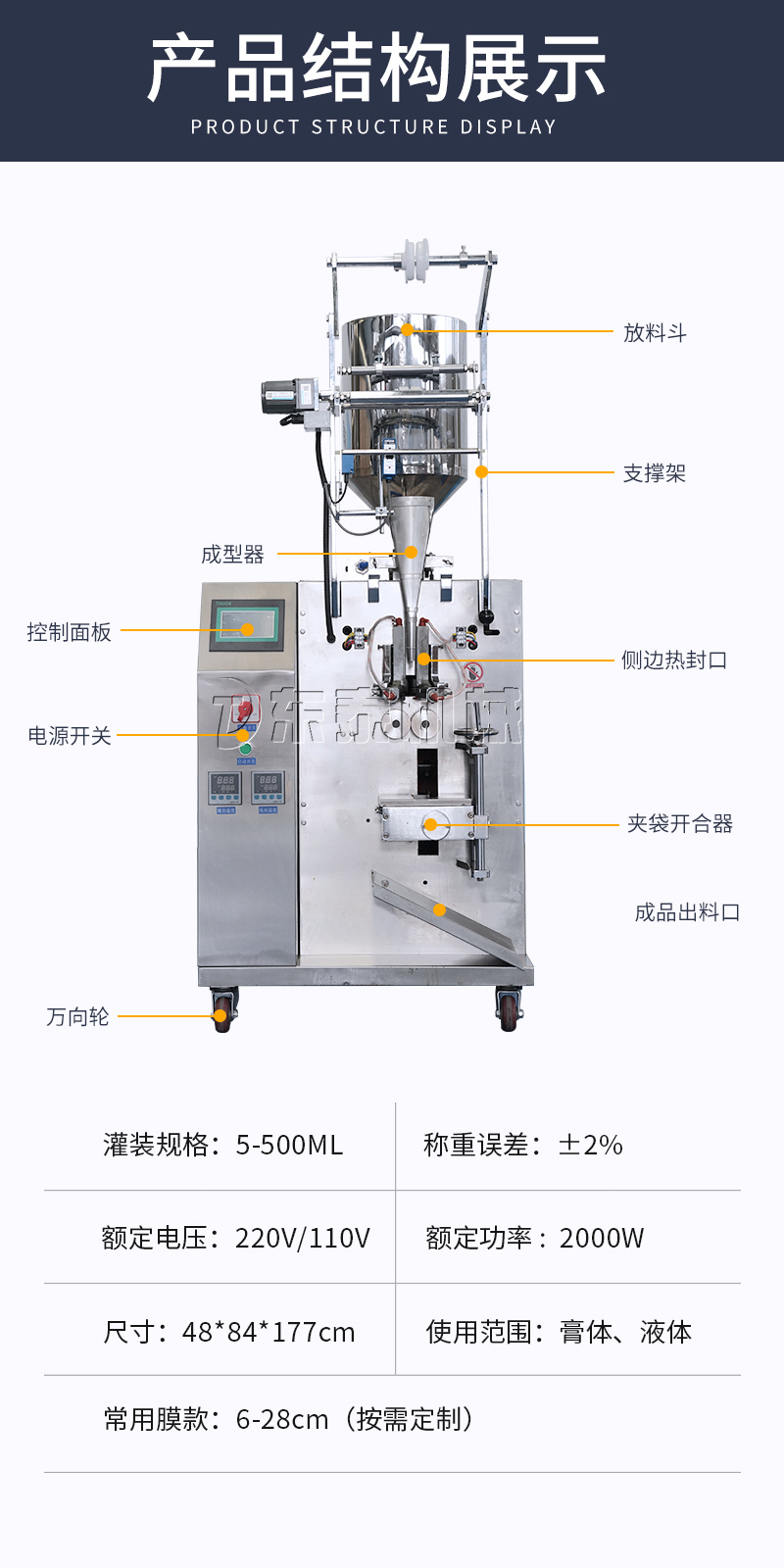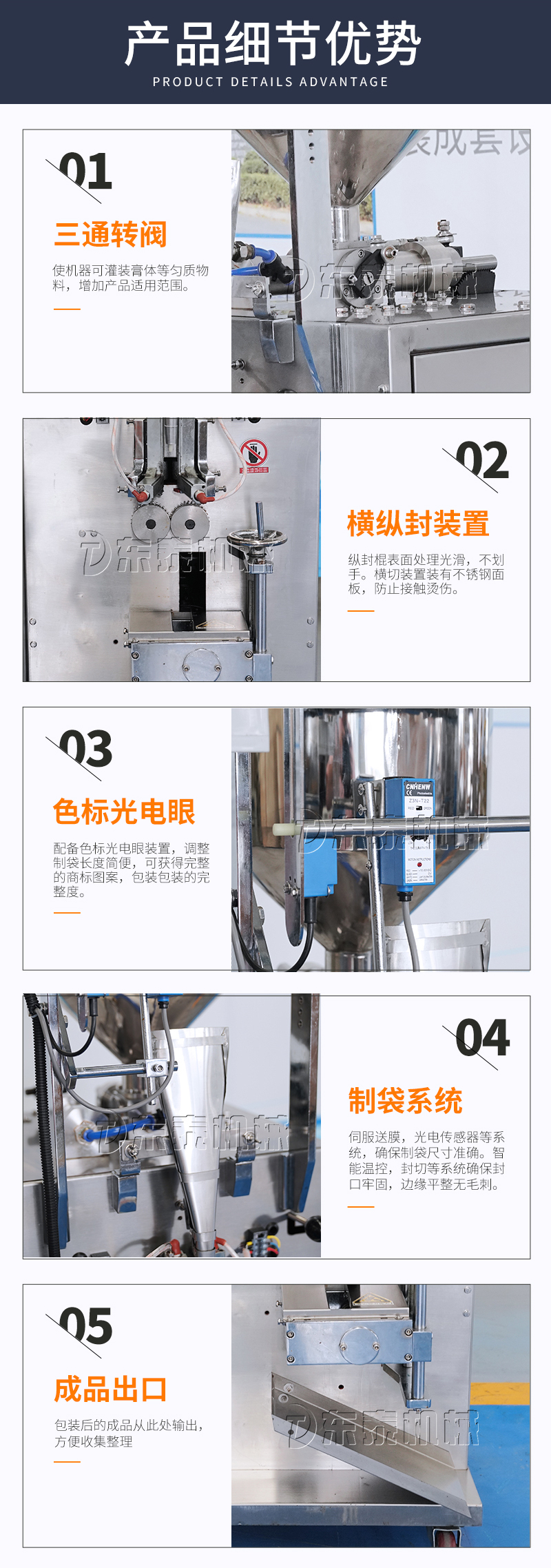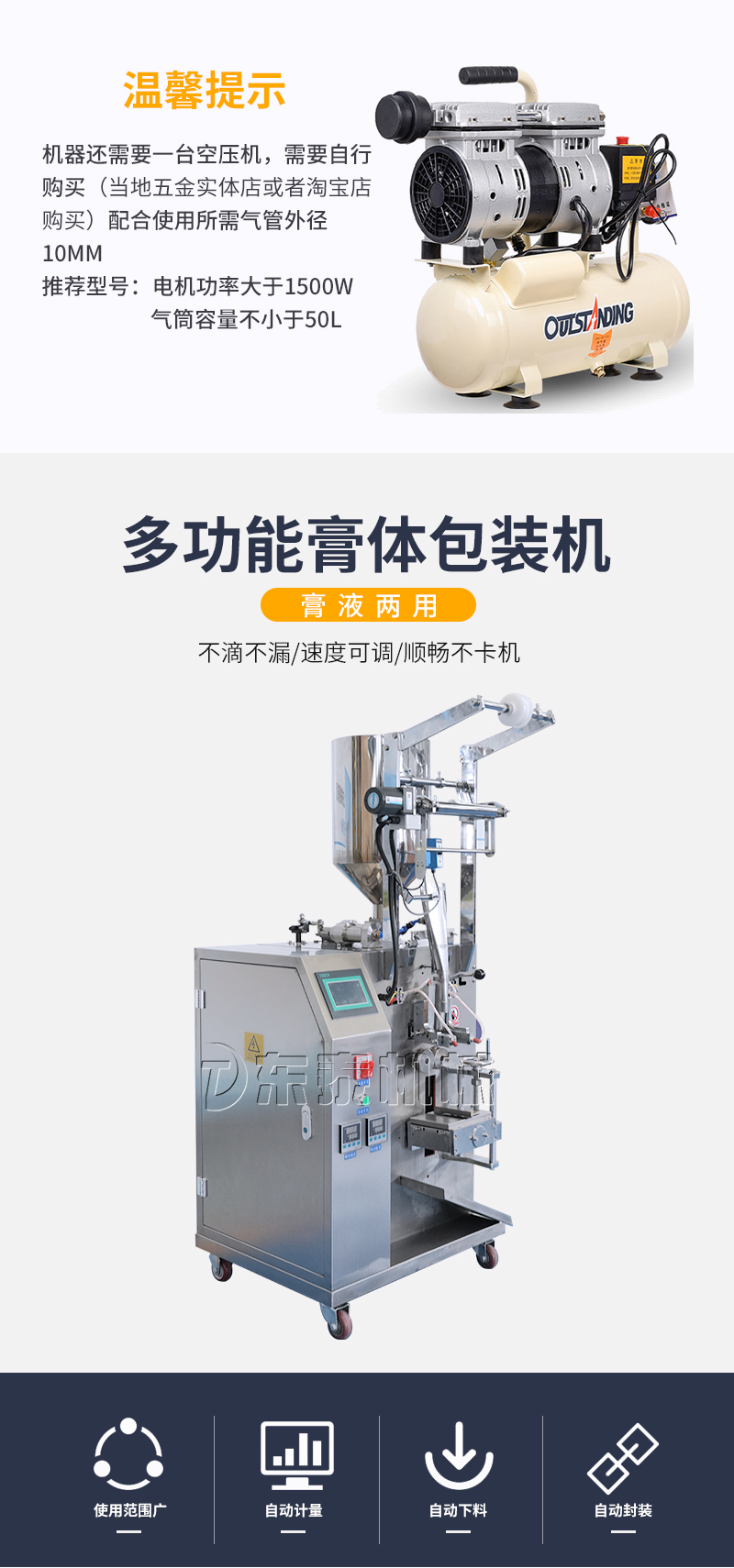 该番茄酱包装机适合各种膏体包装如洗洁精、牙膏、调味品、蜂蜜等。光电跟踪及无极调速于一体,可周期完成下料、计量、日期打印、制袋、充填、封合、热压批号、分切计数等作业。