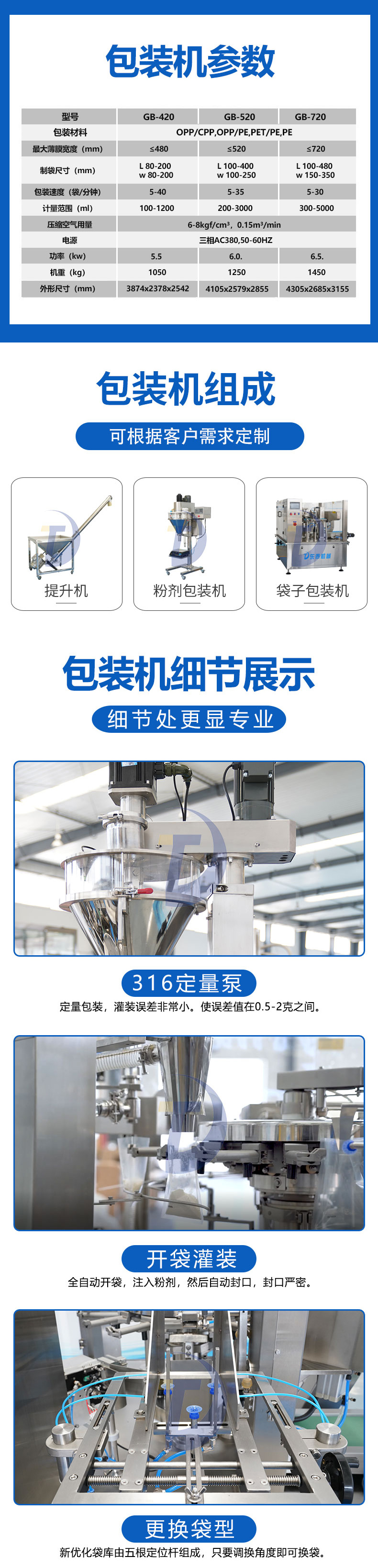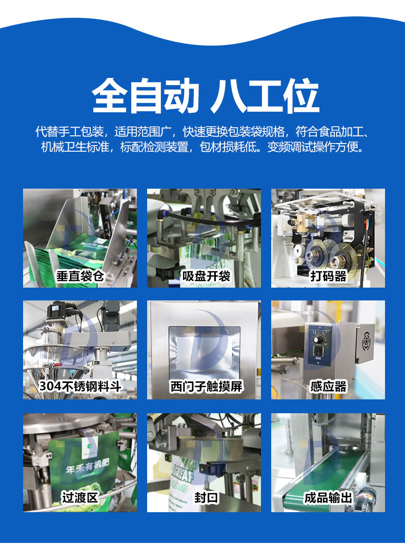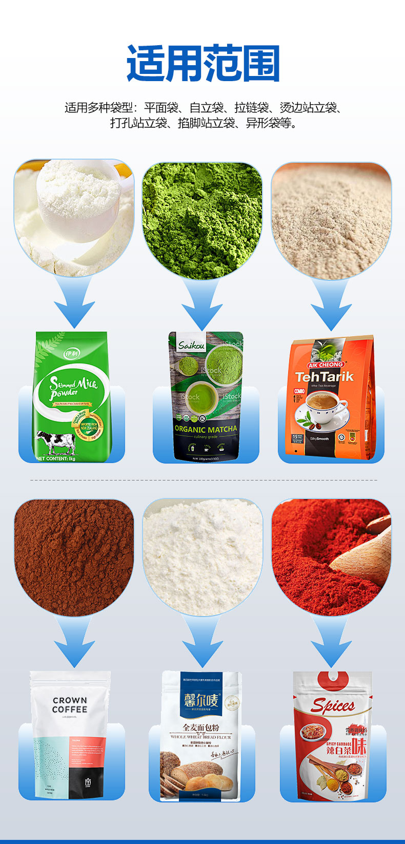给袋式粉末包装机工位功能:一、立式上袋;二、开拉链 、打码;三、下开袋;四、填充+吸尘器(自选);五、扫尘+六 空位七、热封;八、整形输出